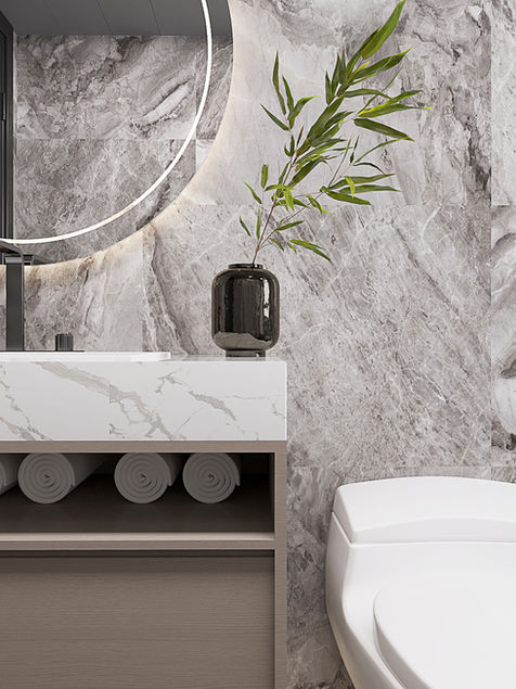 The use of cool, contrasting tones to bring out a modern, elegant look. Designers use high-gloss materials such as marble and light-coloured furniture to enhance the sense of spaciousness and create a luxurious atmosphere. The overall space uses linear elements to shape the visual end scene, and at the same time brings a lustrous layer to the space.